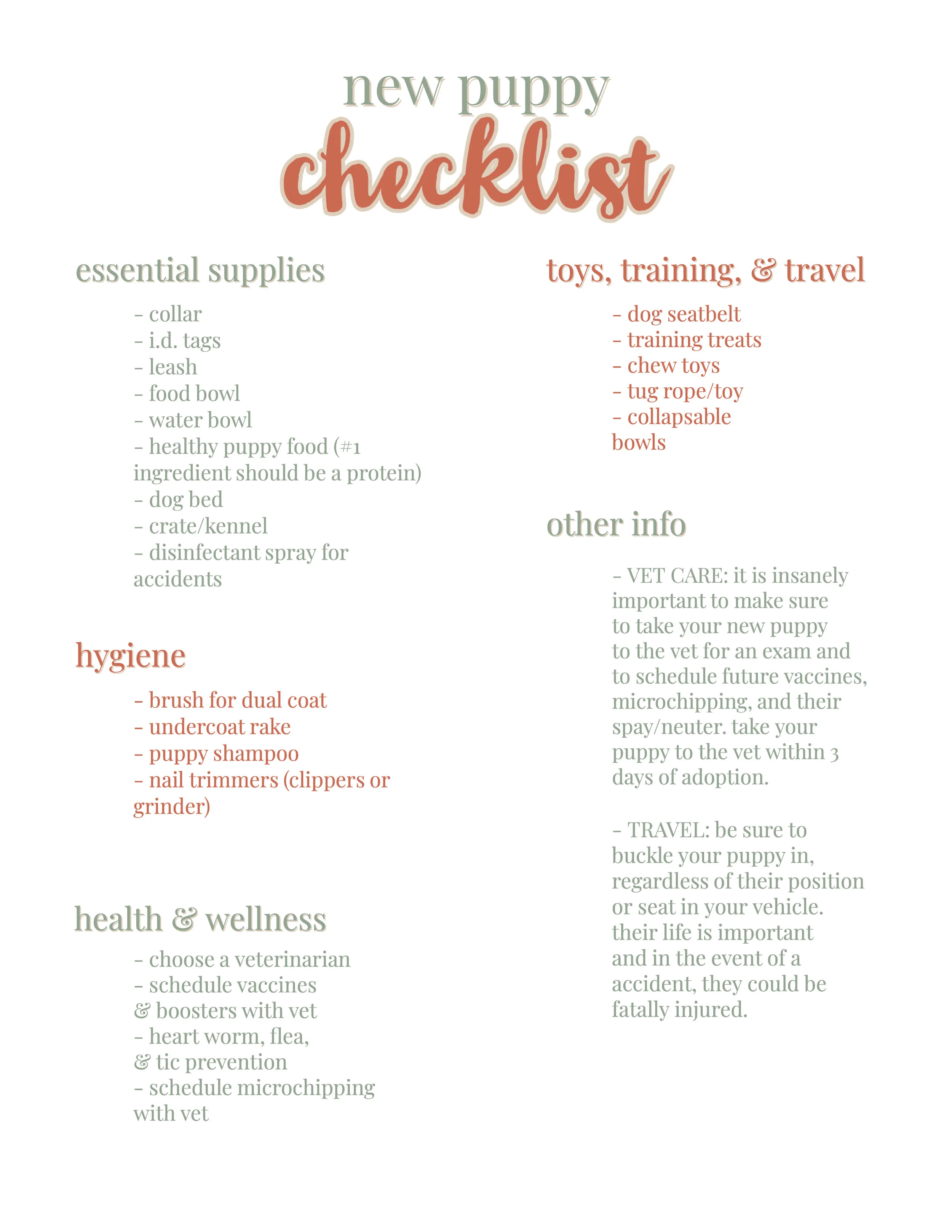Below, you will see a New Puppy Checklist that I made special for those families who will be taking home a Busbee Aussie, but this list works for other puppies, too! I hope this answers some of your questions about how to prepare for your new puppy!
